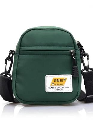 Міні-сумочка через плече в темно-зеленому кольорі. Два відділення на замки. Розмір 15.5×13×7. Підійде,як для дитини,так і для дорослого.