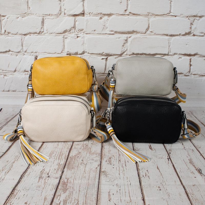 Маленькая, но вместительная сумочка на широком ремне на два отделения. Материал - эко кожа. Аксессуары - никелированные. Сумка украшена съёмным брелком в виде кисточки. Сумка закрывается на молнии. Длинный широкий регулируемый ремень. Ширина ремня - 4 см, максимальная длина ремня - 130 см. На задней стороне имеется горизонтальный прорезной карман на молнии. Внутри - тканевая подкладка, два автономных отделения, каждой из которых закрывается на молнию. В заднем отделении - горизонтальный прорезной карман на молнии. В заднем отделении - карман для документов.