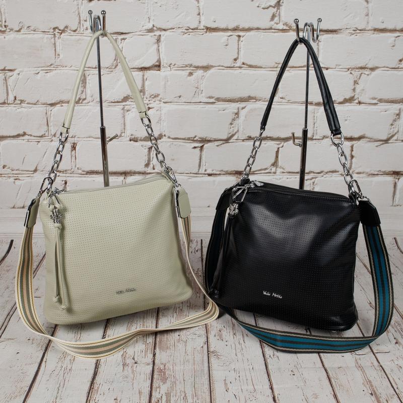 Сумочка среднего размера. Материал - эко кожа. Аксессуары - никелированные. Сумка закрывается на молнии. Одна средняя нерегулируемая ручка на цепочках. Высота ручки - 28 см. Широкая тканевая ручка. Ширина ручки - 4 см, длина ручки - 96 см. На лицевой стороне сумка украшена перфорацией. На задней стороне расположен горизонтальный прорезной карман на молнии