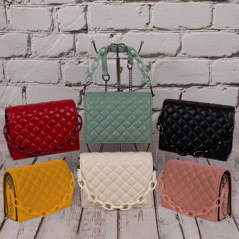 Стильный каркасный клатч. Материал - эко кожа. Аксессуары - чернённые. На лицевой стороне сумочка украшена декоративной прострочкой в тон сумки и пластиковой цепью с крупными звеньями. Сумка закрывается при помощи клапана на двух магнитных застёжках. Одна оригинальная, регулируемая ручка на цепочках. Максимальная длина ручки - 117 см. Внутри - тканевая подкладка, два отделения: сзади - маленькое отделение, спереди большое отделение на молнии.