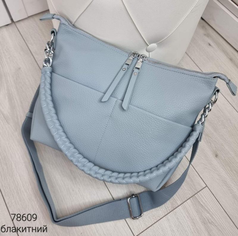 модні жіночі сумки через плече Чудова сумка з ніжної еко шкіри Фурнітура: срібло Розміри: Ширина внизу - 26 см (ширина вгорі - 31,5 см), висота - 22,5 см, дно - 13,5 см + коротка ручка (довжина короткої ручки - 58 см) і довгий текстильний ремінець Матеріал: м'яка екологічна шкіра, підкладка - щільна тканина Склад: Два відділи і між ними кишенька-перегородка з блискавкою. Сверху сумка закривається на блискавку. Усередині є 2 відкриті кишені і кишенька з блискавкою. З передньої сторони сумки - 2 відкриті кишені, а зі зворотного боку - 2 відкриті кишені. Отправка по Украине новой и укрпочтой . Есть наложенный платеж по предоплате за доставку !
