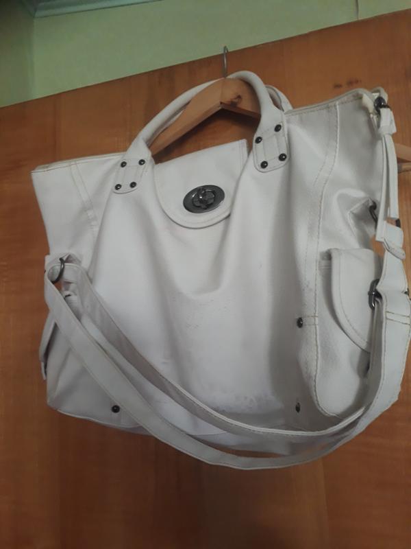 Це дещо велика сумка. Сумка не має протертостей,але має ньюанс ---це плями,які утворились від іншої сумки,яка доторкалась довший час/були складені одна на одну/Замок зовнішній робочий, всередині на кишені.замок не робочий.,з боків є кишеньки Верх--100%поліуретан,підкладка--полієстр Розмір 38×32×10см.Плями не є ярко виражені