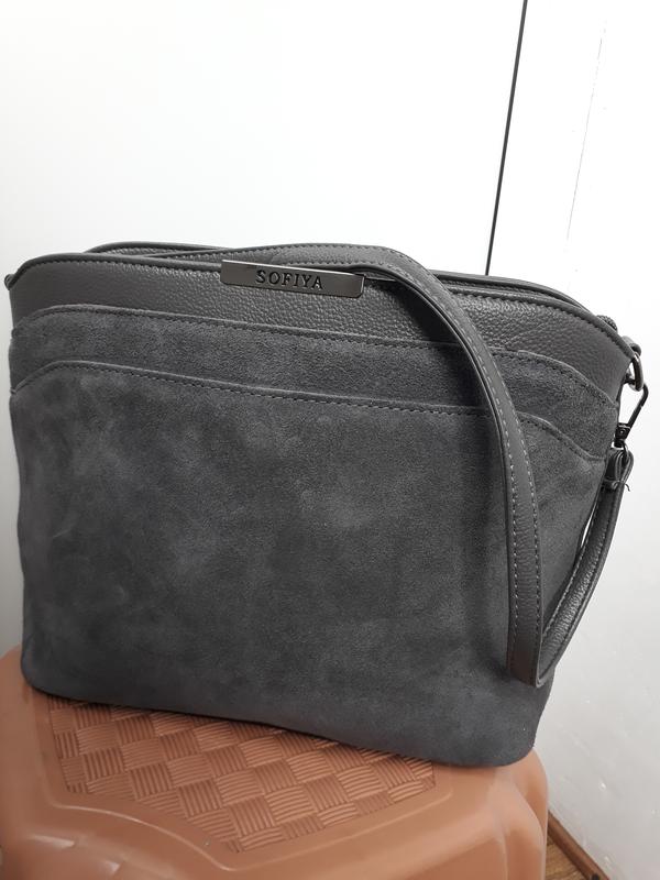 Класична сумочка сірого кольору. Поєднання екошкіри і натуральної замши. Висота 21 см, ширина 33см, два змінних ременці. Стан нової речі.