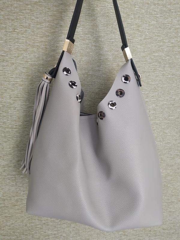 Сумка из искусственной кожи люкс качества, красивая фурнитура в золотке, закрывается на магнитную кнопку, украшена кольцами с животным принтом и бахрамой.В наборе маленькая сумка - косметичка с подкладкой и длинный ремешок. Ш - 40 см. Д - 29 см. Внутренняя сумка 30 на 23 см. имеет отделение на замке и два под мобильный телефон и деньги. Цвет светло серый.
