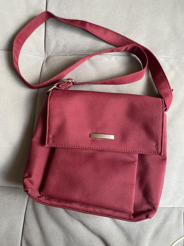 Очень стильная и удобная сумочка от Zanotti( Италия). Ткань плотная, но есть нюанс, маленькая стрелка, когда открывается сумка (см. на фото). Внутри все целое. Много карманов. Качественная подкладка. Ширина 25 см., довжина 21 см.