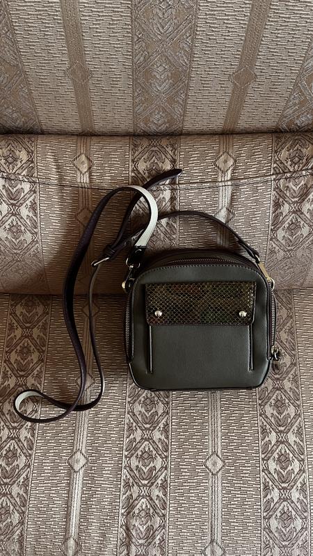 Сумка бренду Accessories оливкового кольору в поєднанні з бордовим, має один відділ і маленьку кишеньку спереду. Сумка в хорошому стані, єдине з'явились потемніння біля кріплення ремінця показані на фото, але при денному світлі фактично непомітні.