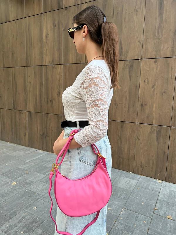 📐 Розмір: 28 х 17 х 8 см 🧵 Матеріал: екошкіра 🔎 Опис: Сумка-хобо середнього формату з м'якої якісної екошкіри рожевого кольору. Має фірмовий напис з металу золотистого кольору, видимою під час носіння сумки на плечі. Застібка на блискавці. Внутрішнє відділення з підкладкою з тканини, металева фурнітура із золотистим покриттям. Модель можна носити на короткому ремінці або через плече, завдяки знімній регульованій ручці та гачкам для кріплення плечового ременя. 🛍Безкоштовне пакування: брендова коробка, наповнювач, пильовик, документи