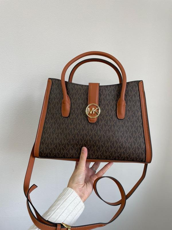 👜 Michael Kors Gabby Large Logo Satchel Brown (Арт: 99115) 💵 3450 грн 📐 Розмір: 30 х 20 х 10 см 🧵 Матеріал: Шкіра 🔎 Опис: Сумка виготовлена з шкіри з фірмовою канвою. Всередині одне велике відділення та дві менші кишені (одна з них на застібці). Також є додаткове відділення котре зачиняється на магніті-клапані. Підкладка з щільного брендованого текстилю. Якісна металева фурнітура, брендована. Для носіння через плече є вузький шкіряний ремінець з регулюємою довжиною.