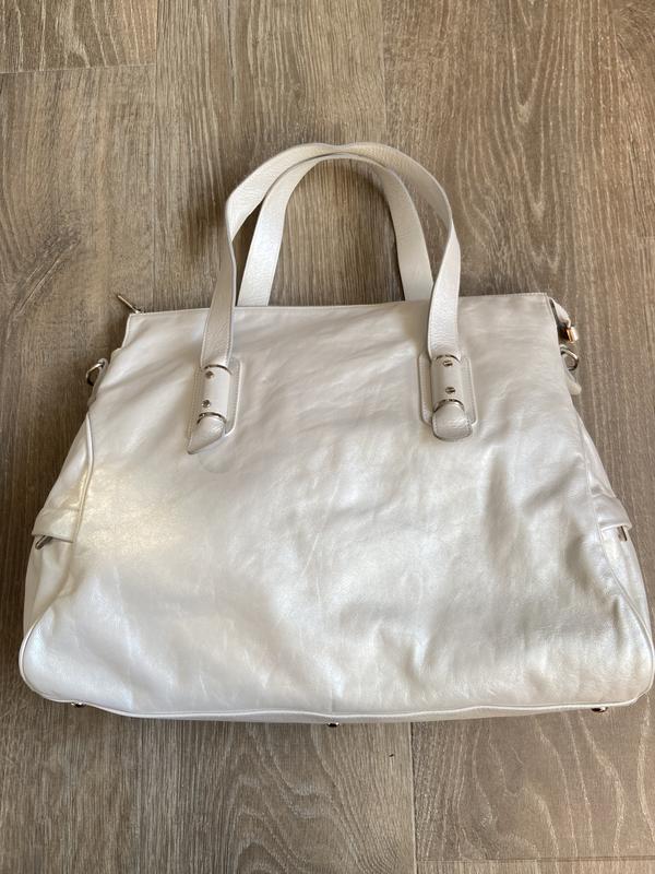 Сумка Texier Матеріал: натуральна шкіра Головне відділення на молніі Накладна кишеня зі шкіри Окреме відділення на молніі Кишеня з не лицьової сторони По бортах кишені на молніі Дві ручки Відсутня довга шлея ! Заміри: ширина верх 42 см., середина 48 см., висота 38 см. , дно 44*18/20 см., довжина ручок 58 см. Колір : перламутр