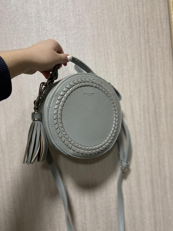 Жіноча сумка круглої форми, такого кольору ніжно бірюзовий між сірим та голубим, нереальний колір який неможливо описати, дуже гарна та прекрасно доповнює ваш образ, має одне велике відділення та маленький карманчик , ремінець знімається і регулюється та брилочок який теж знімається