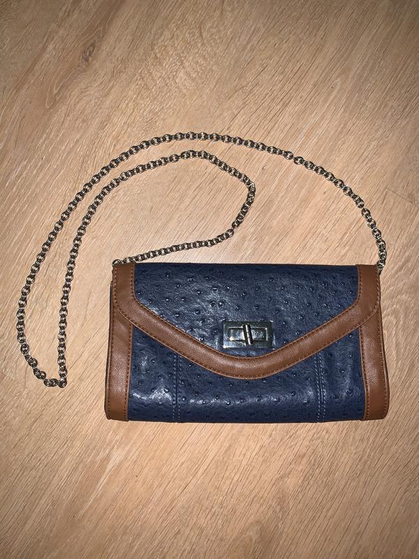 Вмістка сумка клатч APT. 9. Має срібний ланцюжок, який знімається. Колір синій з коричневими краями.