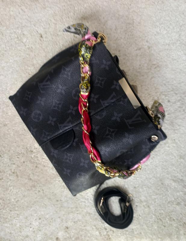Сумка из экокожи, имеет два больших отдела на кнопке, один маленький на молнии. Размер 20×28x10 см. Короткий ремешок цепочка, отделанный платком 42 см. Длинный ремешок регулируется до 120 см.