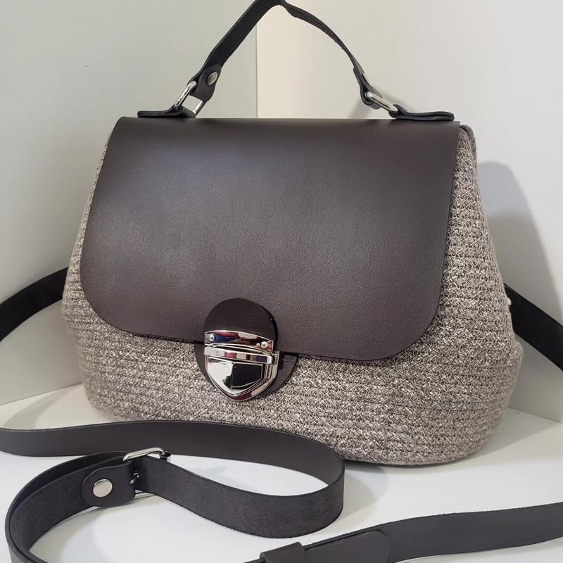 Сумочка ручной работы из хлопкового шнура в цвете меланж пастельно коричневый, украшена кожаной фурнитурой в темно коричневом цвете Сумочка имеет утолщенное кожаное денце на ножках, клапан на застежке, регулируемый кожаный ремень, в середине на подкладе, имеет карман на молнии с хлопковым кружевом и карман открой Под заказом в любых цветах шнура и кожи