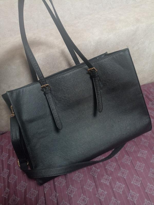 Сумка, в отличном состоянии. Длина ручек регулируется, максимальная 73, минимальная 56 (замеры сделаны от дырочек), есть ремешок для ношения через плечо, длина ремешка 125, регулируется. В сумке много отделений: отделение для ноутбука, среднее отделение на молнии, боковые кармашки для мелочи, и еще одно боковое отделение на молнии для телефона. Сумка закрывается на молнию. Размеры, длина по низу 43, по верху 41, высота 32, ширина боковой стороны15. Очень вместительная.