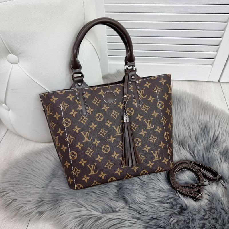 🆕️ Стильная сумка на 3 отдела с рисунком LV на эко коже 🆕️ ФУРНИТУРА: никель РАЗМЕРЫ: Ширина по дну - 26,5 см (ширина сверху - 33 см), высота - 24 см, дно - 11,5 см + ручки и съемный длинный ремешок МАТЕРИАЛ: эко кожа, подкладка - плотная ткань СОСТАВ: три отделения, средний отдел сверху закрывается на молнию и два других отдела - на кнопку-магнит. В середине есть открытый карман и карман на молнии.