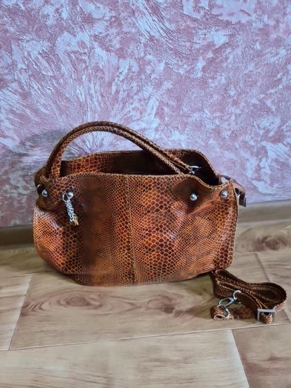 Шкіра ,в ідеальному стані .На два відділення, цупка підкладка.Відділення не вшиті в сумку ,тільки перегородка.Є довга ручка.Майже не носилась. На річці є ротертості,виносила зовсім не видно.