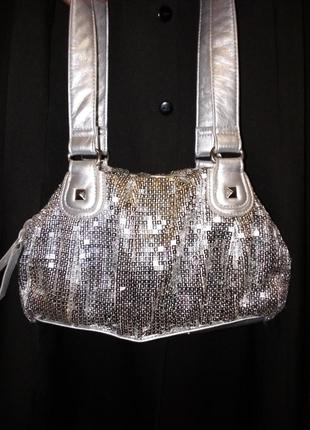 Шикарна сумочка у квадратні пайєтки. М'якесенька і легенька. Ширина 27 см, висота 16 см, глибина 10,5 см, висота ручок 21 см. Всередині одне велике відділення, одне маленьке (можливо, для карток) і одне на блискавці. Зверху з обох сторін великі, глибокі кишені на магнітних кнопках. Стан ідеальний!