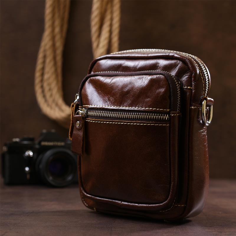 Компактна чоловіча сумка із натуральної шкіри красивого коричневого кольору. Має одне вмістке відділення на блискавці. Всередині відділення потайна кишеня та кишеня для телефону. На зовнішній стороні сумки два відділення на блискавці. На тильній стороні є кріплення, що дозволяє носити сумку на поясі. Також сумку можна носити за допомогою текстильного ременя на плечі або за допомогою шкіряних ручок в руках. Розмір: ширина - 15 см; висота - 19 см; глибина - 6,5 см. Виробник: Китай