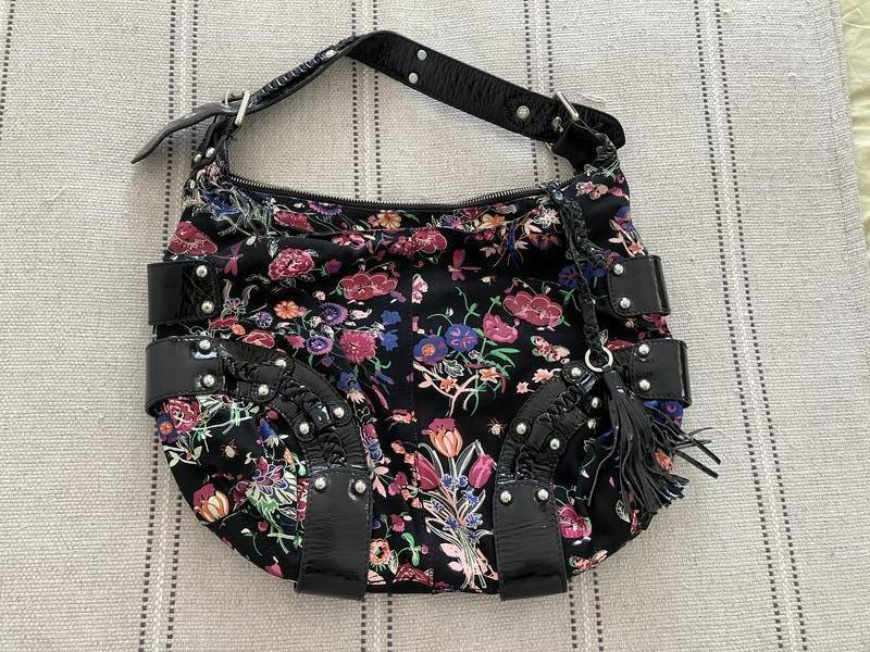Сумка з тканини, фрагменти з лакованої натуральної шкіри. Фурнітура у сріблястому кольорі. Розмір середній: 42см на 30см. Має внутрішню бічну кишеню на замку, три відділення (одне з яких теж на замку) та дві кишеньки під телефон чи ключі. Закривається сумка на блискавку.