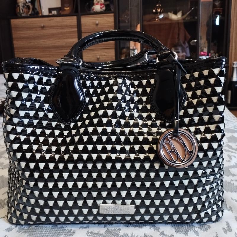 Дуже крута сумочка Principles від бренду Ben de Lisi ,вона лакована чорна, якісна фурнітура дуже вмістка,стан нової, нарікань взагалі немає,три відділення по бокам кишенькі для дрібниць ширина 27см, висота 20 см,дно 12см, ручки 29 см, рекомендую 👌