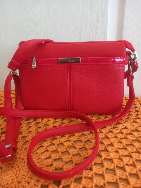 Чудова жіноча сумочка невеликого розміру з якісної штучної шкіри. Має довгу та коротку ручку на карабінах. Довга ручка легко регулюється по довжині. Сумка закривається на блискавку. Сумка вмістка, всередені має 6 різних відділів, два з яких на блискавці. На передній стороні глибокий відділ на блискавці. На зворотній стороні відділ для телефона на блискавці. Фурнітура якісна,підкладка текстильна. Розмір сумки ( ШхВ) 25×18см, дно 6см. Колір червоний. Бренд Gilda Tohetti.