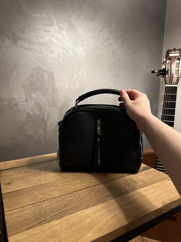 чорна сумочка має додатковий ремінець. Діаметр 18 см висота та 22 см. Має 2 великіх кішени і ще один посоредині і 2 маленьких спереду та позаду. Сумочка в хорошому стані