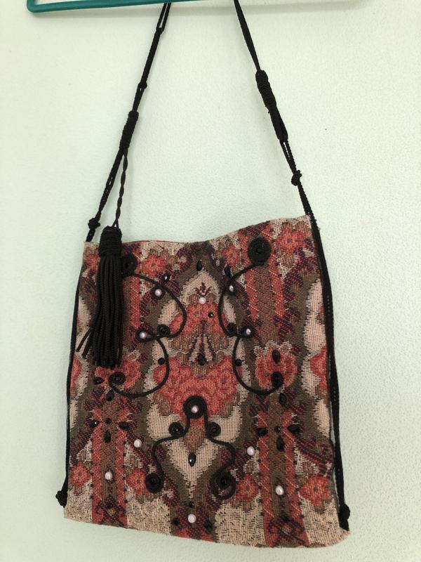 Нова жіноча сумочка, оздоблена бусинками та камінчиками, має красиву ручку.