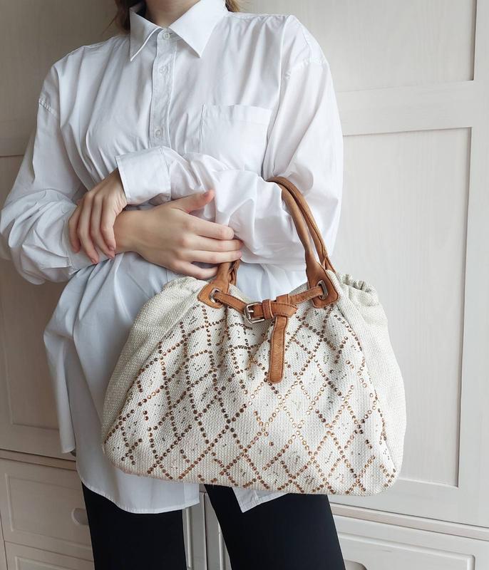 Сумка світлого кольору ,матеріал льон з стразами, замки всі працюють,шкіряні ручки стан 9/10,є мал.недоліки на останніх фото