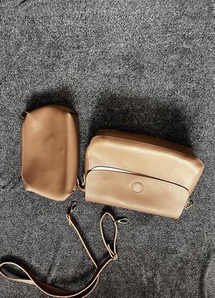 Жіноча сумка 2в1. Має один довго ремінець що регулюється. В середині немає підкладки, але є ще одна маленька сумочка яка може бути косметичною або носити як окрему сумочку. Стан відмінний без жодних дефектів.