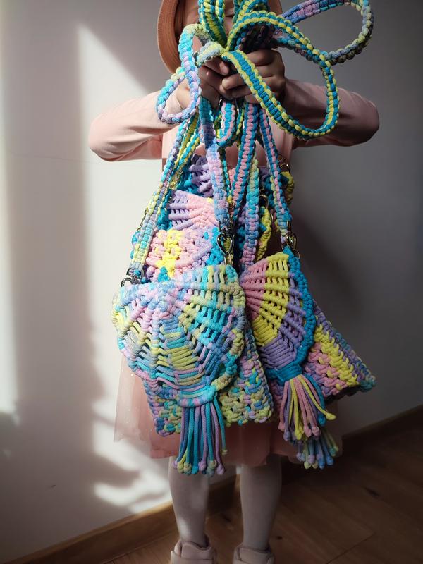 Пропоную плетені в техніці макраме кольорові сумочки макраме. Матеріал: хб шнур, кольоровий градієнт. Легко вміщує в себе мобільний, блиск для губ, ключики, цукерку - все що потрібно принцесі) Має з'ємний пасок, металева фурнітура, плетення щільне, гарно тримає форму. Кожна сумочка ексклюзивна і неповторна.