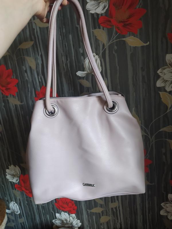 дуже зручна, маленький дефект на фото при носці не помітний.Вмістка,висота ручки34