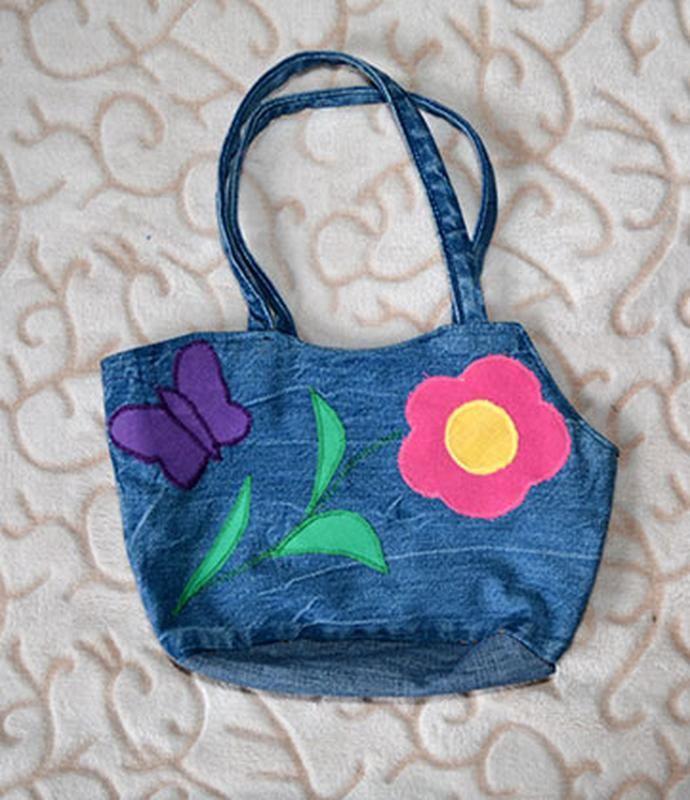 Детская джинсовая сумочка ручной работы. Для игрушечной собачки. Размеры: высота- 16см (без ручек), ширина- 27см.