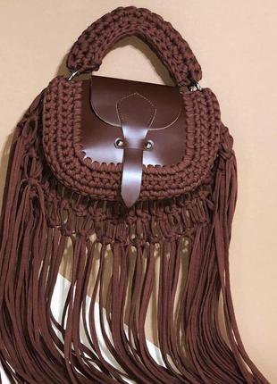 Сумочка с бахромой. Такая сумочка обязательно будет центром вашего образа. Вся фурнитура кожаная. Размеры: 23 х 15 х 7 см Длина ремня: 120 см Длина бахромы: 40 см Цена: 1300грн. Дополнительные характеристики: Цвет : Коричневый Материал : Кожа Материал : Трикотажная пряжа Модель : Через плечо Размер: Средний
