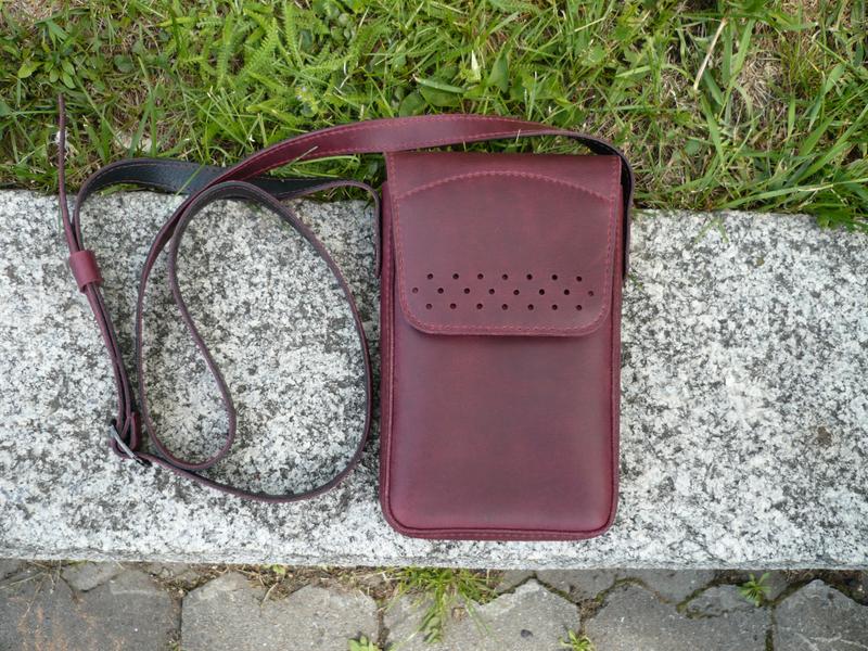 Шкіряна сумочка для телефону. Шкіра ВРХ «crazy horse», колір марсала. Одне відділення , внутрішня кишеня , задня кишеня . Клапан фіксується магнітною кнопкою. Розмір: 180*120*25 мм. Сумочка прощита вощеною ниткою, фінішне покриття - крем IEXI wrens dubbin (Італія). Ручна робота. Цінність: 1100 грн.