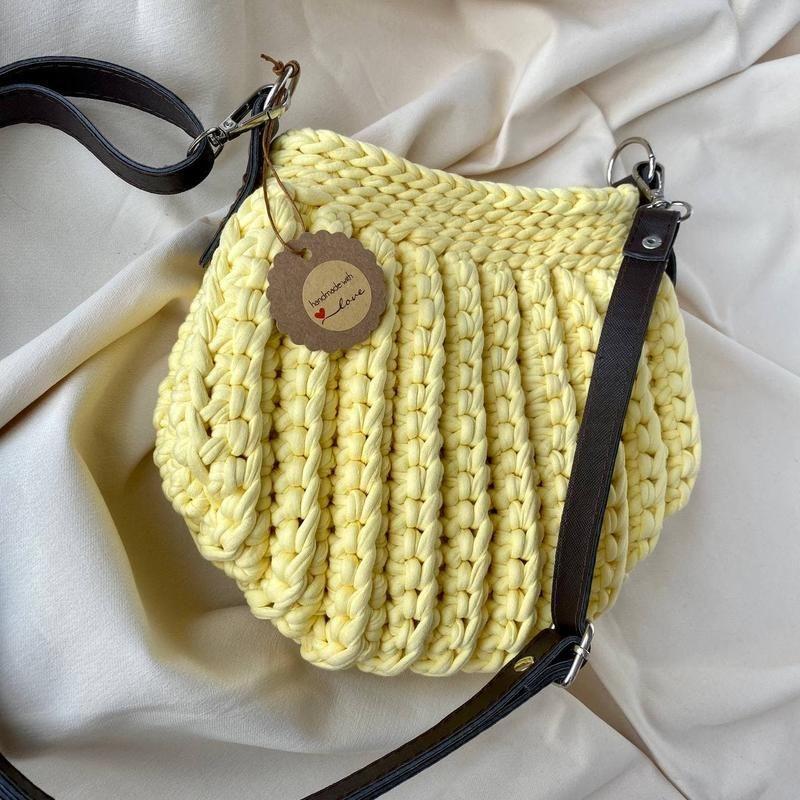 Сумка ручної роботи з трикотажної пряжі. Ремінець з штучної шкіри. Застібка на застібці. Розмір сумки: висота 20, ширина 23. Додаткові характеристики: Колір: Жовтий Матеріал: Пряжа трикотажна Модель: М'яка Модель: Через плече Розмір: Маленький