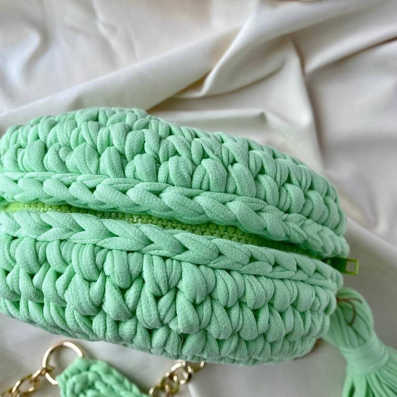 Сумка ручної роботи з трикотажної пряжі. Ремінець з металевої золотистої ланцюжка. Застібка на змійці. Розмір сумки: висота 18, ширина 18, глибина 8. Додаткові характеристики: Колір: Зелений Матеріал: Пряжа трикотажна Модель: М'яка Модель: Через плече Розмір: Маленький