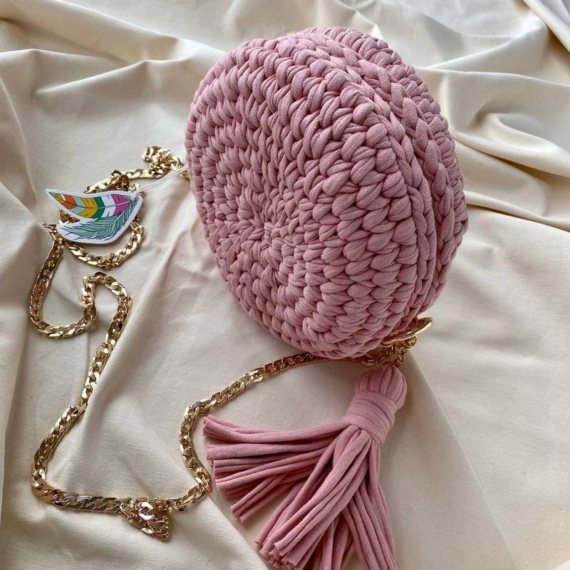 Сумка ручной работы из трикотажной пряжи. Ремешок из металлической золотистой цепочки. Застёжка на змейке. Размер сумки: высота 18, ширина 18, глубина 8. Дополнительные характеристики: Цвет : Розовый Материал : Трикотажная пряжа Модель : Мягкая Модель : Через плечо Размер: Маленький