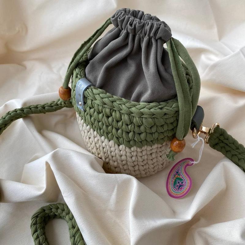 Сумка-відро ручної роботи з трикотажної пряжі. Ремінець в'язаний. Розмір сумки: висота 13, ширина 15, глибина 13. Додаткові характеристики: Колір: Бежевий Колір: Зелений Матеріал: Пряжа трикотажна Модель: Сумка-мішок Модель: Через плече Розмір: Середній
