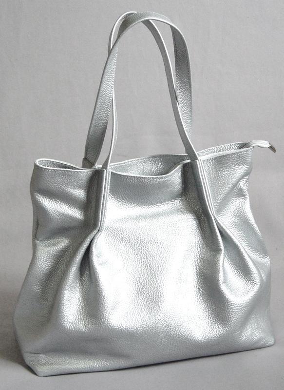 Сумка шоппер виконана з шкіри сорту "флатар" сріблястого кольору. (Можлива заміна колірної гами на Ваш смак.) Закривається на застібку блискавку і має один відділ. У підкладці з натурального льону кишеньки - один на блискавці, один для моб.тел.,ключів і документів. Дно щільне , дубльовано "ізолон". Сама м'яка сумочка, але тримає форму порожній (представлено на фото). Довжина ручок дозволяє ностить її як на плечі, так і в руці. З'явилися побажання або питання по даній сумочці-пишіть,із задоволенням відповім.... Розмір:ширина 41 см по верху і низу, висота 35 см, дно 16 см, ручки 65 див. Додаткові характеристики: Колір: Сріблястий Матеріал: Шкіра Модель: М'яка Розмір: Великий Товар виготовляється на замовлення