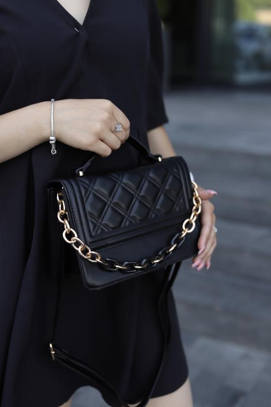 Чорна сумка з тисненням попереду і золотим декоративним ланцюжком. Маленька ручка + додаткова довга. Закривається на магніті. Висота - 15 см Довжина- 23 см Ширина -8см