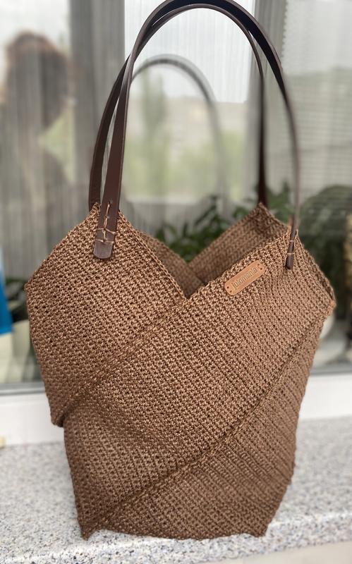 Еко сумка Діагональ з натуральної рафіі. Вмістка.Денце 20х20см. Є кішеня. Шкіряні ручки. Колір шоколад. Стильна,практична,екологічна!