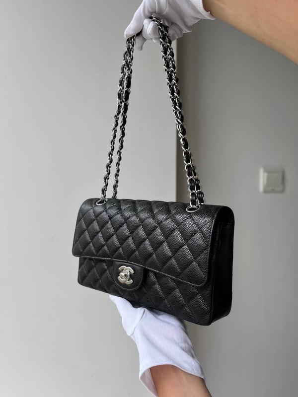 Сумка chanel 25.5 х 15.5 х 6.5 Шкіра caviar Фурнітура срібло Серійний номер 2 коробки : 1) транспортна , 2) Коробка трансформер на магнітах, Пильник , карточка , пакет документів 5850 грн
