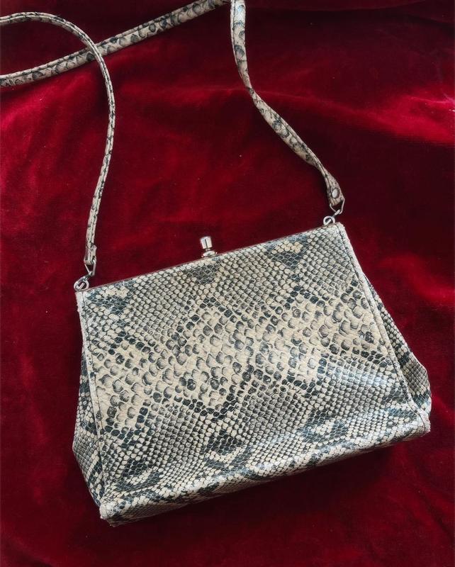 Вінтажна сумочка 1960-х років у зміїний принт з фермуаром та довгою ручкою через плече🐍 Матеріал дуже нагадує справжню шкіру пітона - м’який на дотик, унікальний малюнок та рельєф. Проте з часом місцями з’явилися потертості, але це цілком виправдано віком сумочки, якій понад 60 років 💔 Стан виробу я б оцінила на 3,5 з 5. Всередині на тканині залишилися плямки від косметики. Фермуар закривається надійно, метал золотистого кольору. Ручка досить довга для того, аби носити сумку на плечі - 61 см Розміри без ручки - 21х15