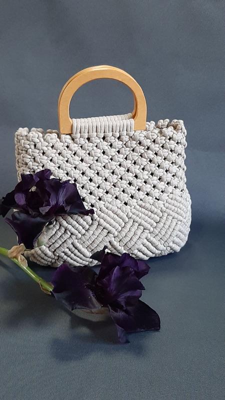 Виконана в техніці макраме. Розміри ✔ширина 24см ✔висота 19см (з ручками 29см) ✔глубина 11см Матеріли ✔ бавовняний шнур ✔ручки - дерево ✔ підкад 100 бавовна