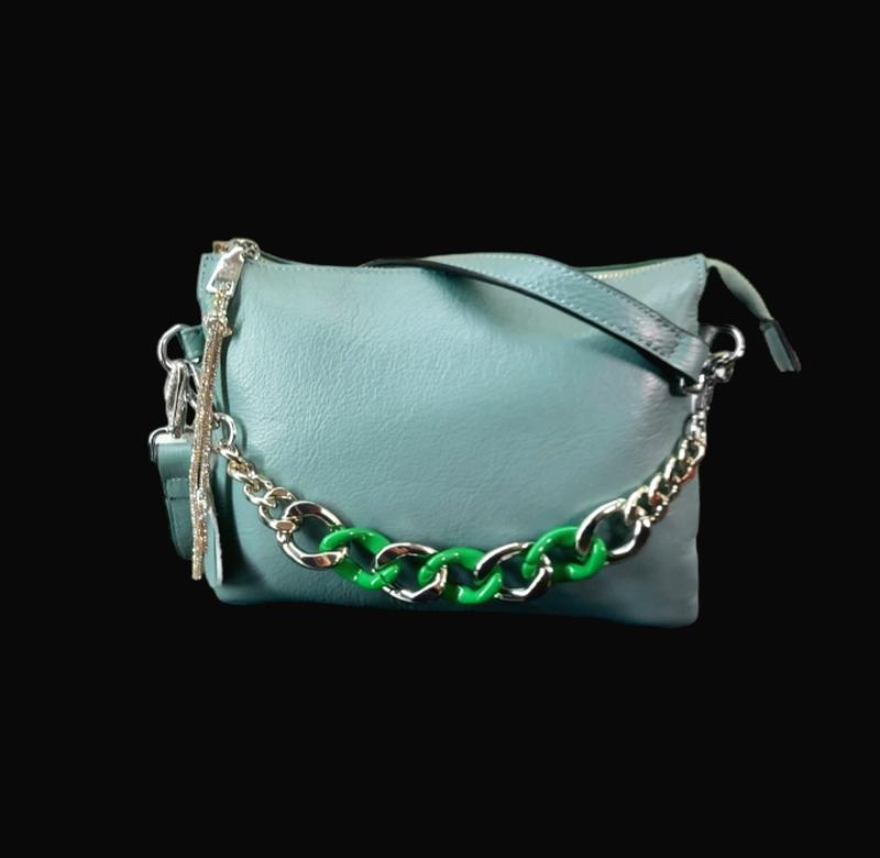 Сумка жіноча натуральна шкіра, ТОП якість шкіри Виріб відомої турецької фабрики Maryam Маленький жіночний розмір сумочки, яку зручно носити через плече плечовий шкіряний ремінь(регулюється 80-110 см) подовжена шкіряна ручка-пасок 60 см Насичений бірюзово-сірий колір М'яка структура, два відділення та відділення на перетині двох основних, всередині малі кишеньки для дрібниць Сумка прикрашена декоративним кольоровим ланцюжком та довгим блискучим брелоком блискавки. Розмір: Довжина 23 см Висота 17 см глибина 6 см
