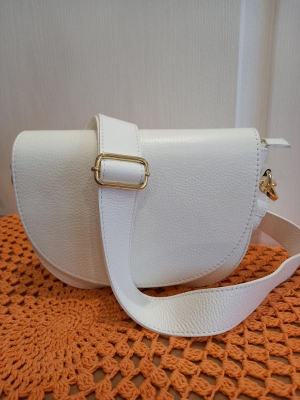 Стильна жіноча сумка з якісної натуральної шкіри. Розмір 24х19х8см. Добре тримає форму. Сумка закривається на клапан з магнітною кнопкою. Всередині сумки 1 великий та 1 невеликий відділ на блискавках . Сумка має довгу широку шкіряну ручку на карабінах. Фурнітура якісна, підкладка текстильна. Колір білий. Матеріал натуральна шкіра. Виробник Італія.