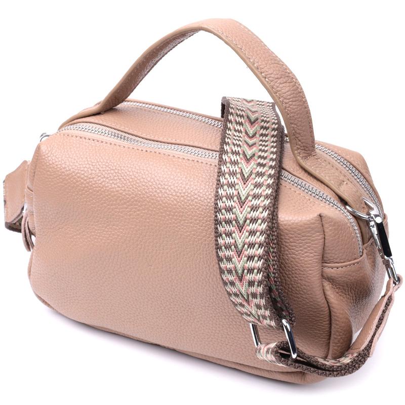 Колір: бежевий; Матеріал: натуральна шкіра; Розмір (ШхВхГ, см): 22х13х11 см; Країна-виробник: Китай Бренд: Vintage. Особливості: - два автономні відділення, що закриваються на змійки; - всередині: потайна кишеня на блискавці в одному відділенні та кишеня відкритого типу в другому відділенні; - кишеня на блискавці, на тильній стороні; - шкіряна ручка для перенесення в руках; - знімний текстильний ремінь. Жіноча сумка на два автономні відділення з натуральної шкіри флотар, яка невибаглива в догляді та довго носиться. Аксесуар складається з двох основних відділень, потайної кишені на блискавці, кишені відкритого типу та кишені на блискавці зовні. Носити сумку можна в руках, на плечі та через плече, для цього є шкіряна ручка та текстильний ремінь. Виріб має якісну фурнітуру кольору срібла. Універсальний варіант сумки як на вечір, так і як сумочки на кожен день.