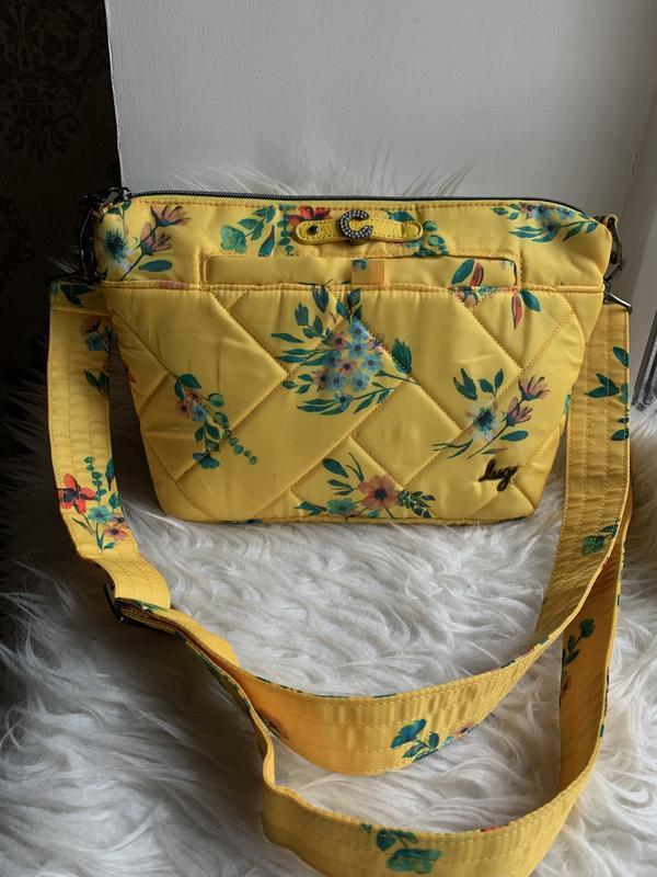 Яскрава сумочка 21x31 см, дно 8 см, ремінь регулюється 150 см (ширина 4 см). Спереду кишенька, ззаду кишенька на застібці. Один основний відділ на застібці, усередині відділи для карток і гачок для ключів. Стан загалом ідеальний, спереду є незначні цятки ( фото 9-10), на носіння не впливає.