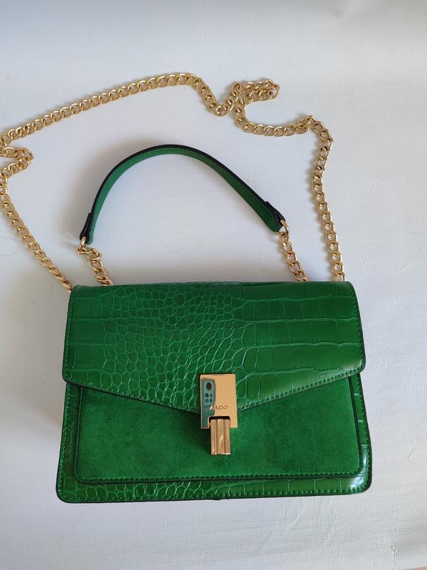 Яркая новая сумка от Aldo Сумка носится через плечо Поворотная застежка-кнопка Одно большое отделение, карман на молнии для мелочей и маленький дополнительный боковой карман внутри, а так-же дополнительный карман впереди. Плечевой ремень с цепочкой Материал - качественная экокожа. Длина ручки 115 см Размер 23*16*7 см. Новая, в использовании не была, есть незначительные царапинки на замочке.