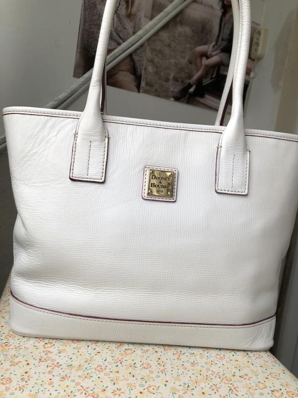 Сумка біла шкіряна. Dooney & Bourke 1975. Це Американська фірма. Відшивалася ця сумка в Китаї. Висота її 23 см, ширина 36 см. Довжина ручок 21 см. Має багато внутрішніх карманів та один зовнішній. Стан задовільний. Якісна шкіра.